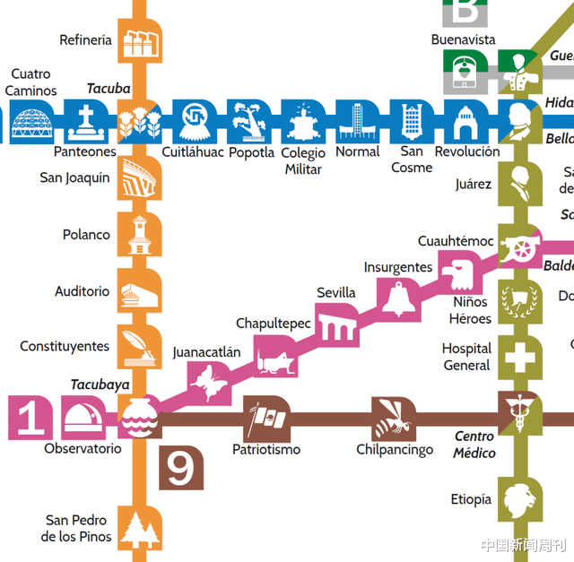 墨西哥城地铁线路图(部分),中间粉色的是一号线。时过境迁,民众的文化水平有很大提升,图案也开始与站名相匹配,成为墨西哥城地铁的文化符号 | 图源:mexicometro.org