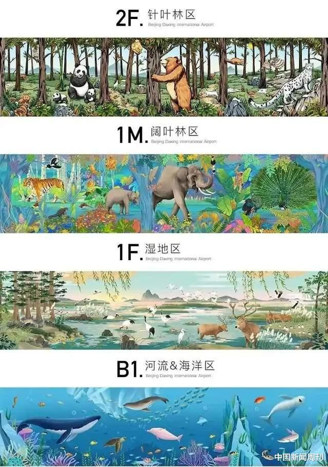 虹桥机场停车楼的最高层,就是“站得高看得远”的长颈鹿。北京的大兴机场也与世界自然基金会、中国野生动物保护协会合作,为航站楼和停车场设计了保护野生动物的公益插画,其停车场使用指引的图案也与这些动物生活的海拔高低相契合(针叶林最高,水下生物最低)。