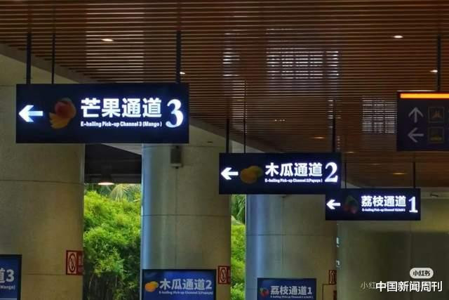 海口美兰机场T1航站楼,在网约车上客点用水果站牌表示不同通道,其中不乏山竹、木瓜、荔枝等热带特产,饶有趣味。
