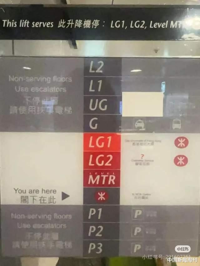 香港九龙塘又一城的电梯,包括P层、LG层、UG层等许多夹杂着英文字母的楼层。不妨试着猜猜看,上面的哪个才是真正联通地面的“1楼”?| 图源:小红书@小biu,已获授权